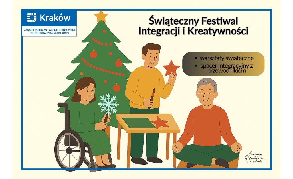 Z radością informujemy, że Fundacja Kreatywna Pracownia realizuje projekt „Świąteczny Festiwal Integracji i Kreatywności”, dofinansowany ze środków Urzędu Miasta Krakowa. Inicjatywa skierowana jest do młodzieży i dorosłych z niepełnosprawnościami (16–65 lat) zamieszkujących Gminę Miejską Kraków.